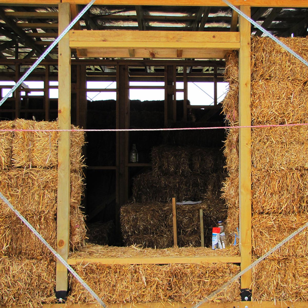 The eaves are designed so the summer sun doesn’t hit the front windows but the lower winter sun heats up the house. A wood fire in winter warms up walls made of clay and rocks, which hold the heat when the fire is out.Â
